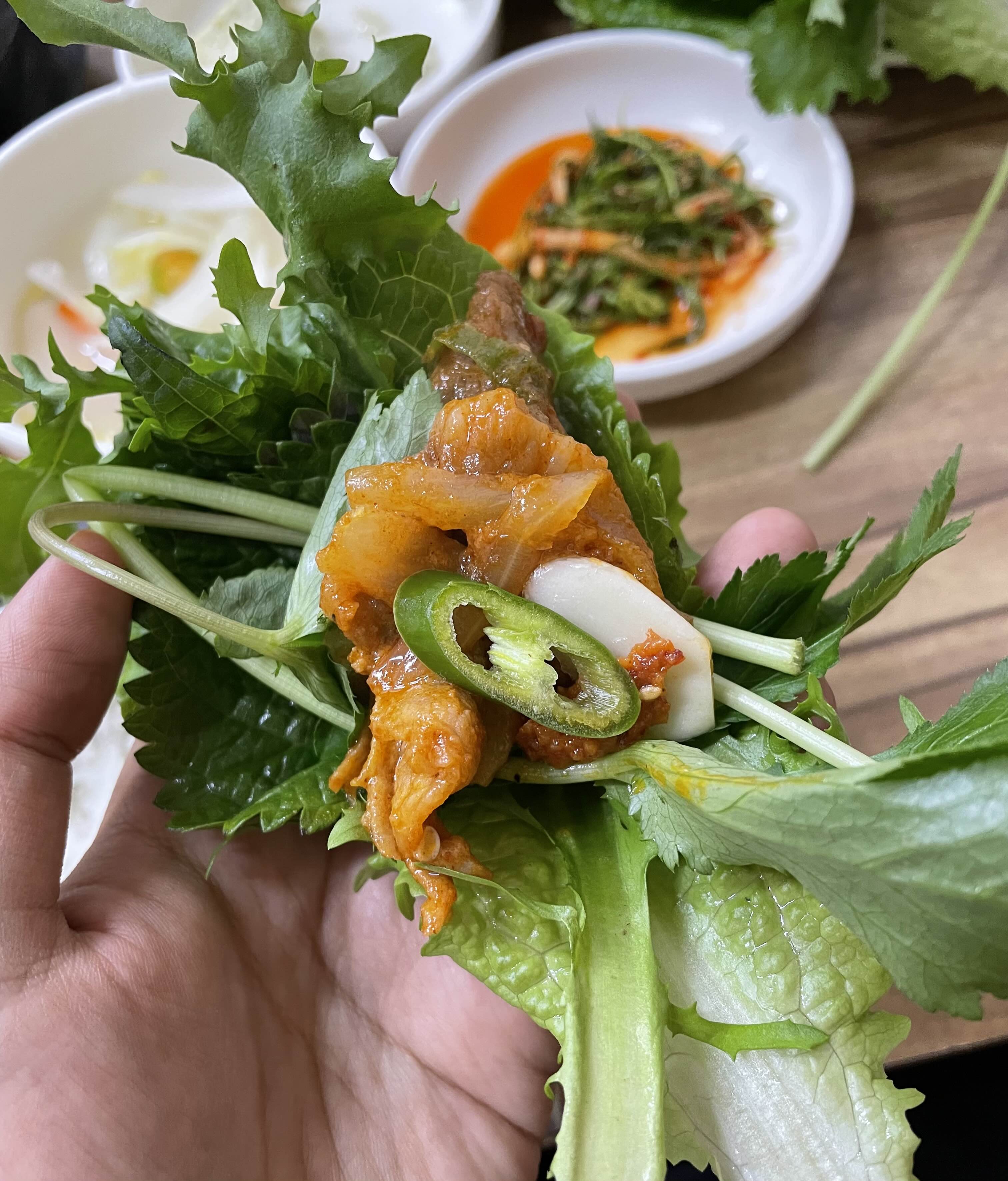 다양한 종류의 쌈을 먹고 싶은 만큼 골라서 고추장불고기를 올려서 먹으면 그만한 게 없어요.